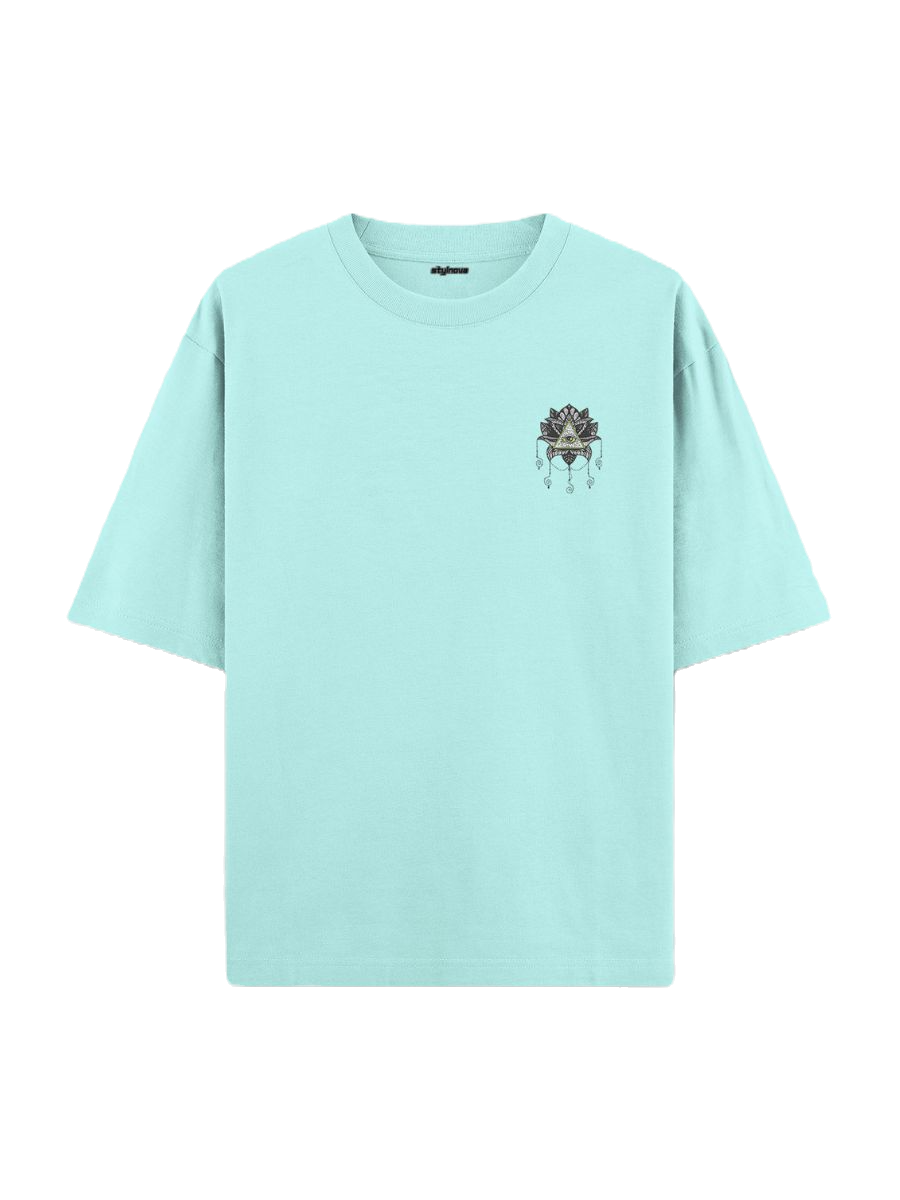 The back of the t-shirt features a captivating graphic of an eye within a triangle, surrounded by intricate mandala patterns and a bold red circle. The phrase "All Eyes on Me" is prominently displayed, emphasizing confidence and individuality. The detailed artwork is set against a refreshing mint background, creating a visually striking and thought-provoking piece.
