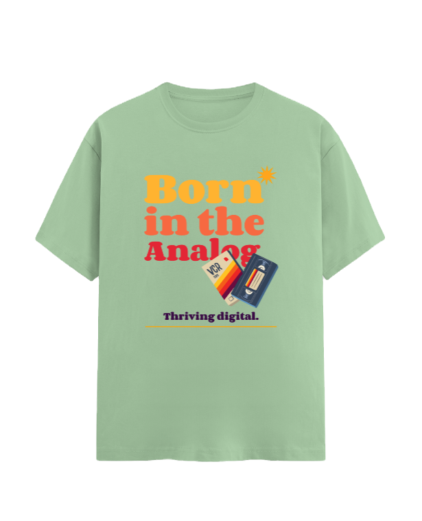 Celebrate the nostalgia of analog with a modern twist in this pastel green regular fit t-shirt. Featuring a retro-inspired graphic with a VCR tape and cassette, the design boldly reads "Born in the Analog, Thriving Digital." Made from breathable cotton, this tee is perfect for anyone who appreciates vintage vibes while embracing the digital age. A must-have for creative minds, tech lovers, and retro fans.