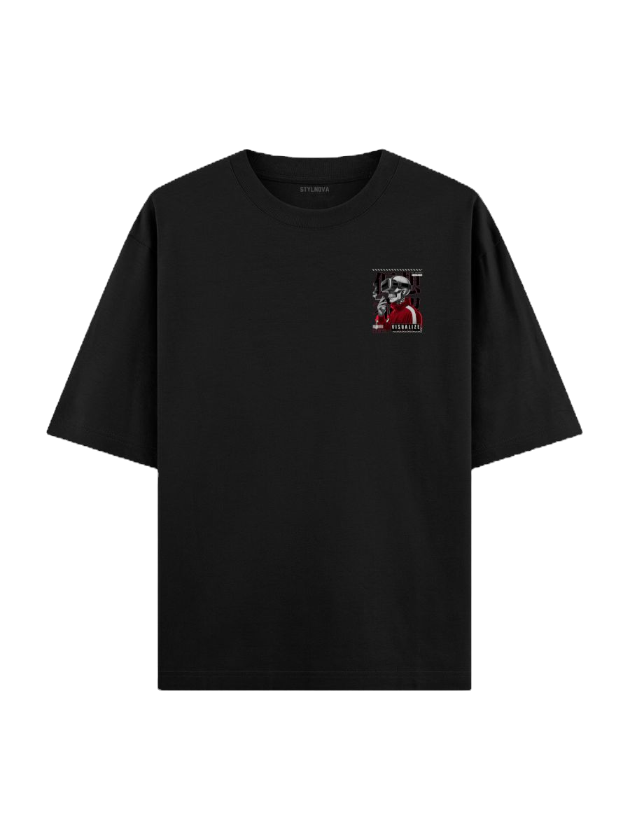 imagination with the Stylnova "Visualize" oversized t-shirt, a bold statement piece that merges the surreal with the digital. Featuring a striking design of a skeleton adorned in VR gear and a stylish tracksuit, this tee encapsulates the fusion of reality and the virtual world. The edgy graphic is complemented by a sleek color palette of black, red, and white, making it perfect for those who live on the cutting edge of fashion. Whether you're hitting the streets or exploring virtual worlds, this t-shirt will keep you looking fresh and futuristic.